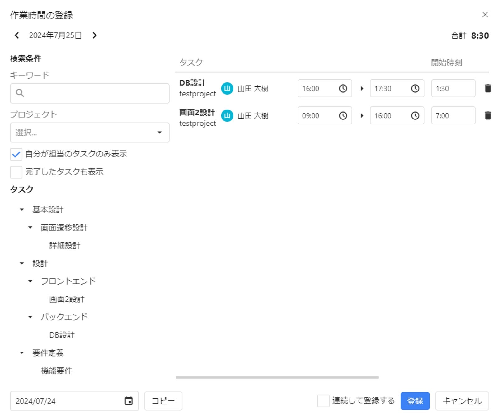 自分の担当タスクが初期表示され、複数タスクの作業時間をまとめて簡単に登録できます。