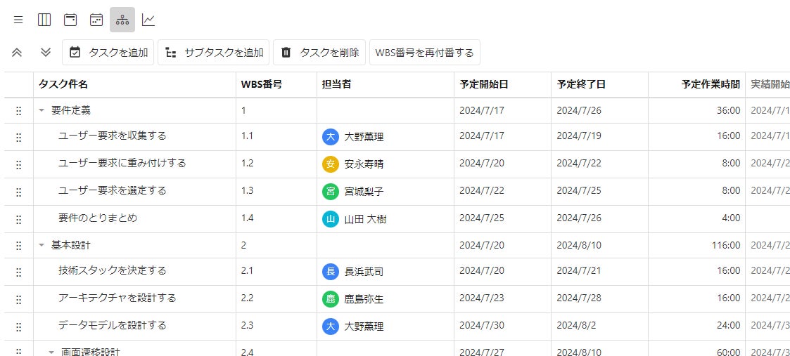 プロジェクトに必要な作業全体を階層構造で表現し、タスクの予定作業日や予定作業時間、担当などを簡単に追加・修正できます。
