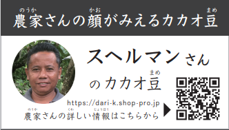 これまで、本キットに使われている生カカオ豆は、当社の契約農家が栽培したインドネシア産のカカオ豆を100%使用しておりました。今回のリニューアルでは、パッケージの裏にどのカカオ農家が栽培したカカオ豆か分かるシールが貼付され、そのシールにあるQRコードを読み込むと、それぞれのカカオ農家の紹介ページをご覧いただけます。「インドネシア産のカカオ豆使用」から「農家の○○さんのカカオ豆使用」へ、原料のトレーサビリティを大幅にアップグレードいたしました。