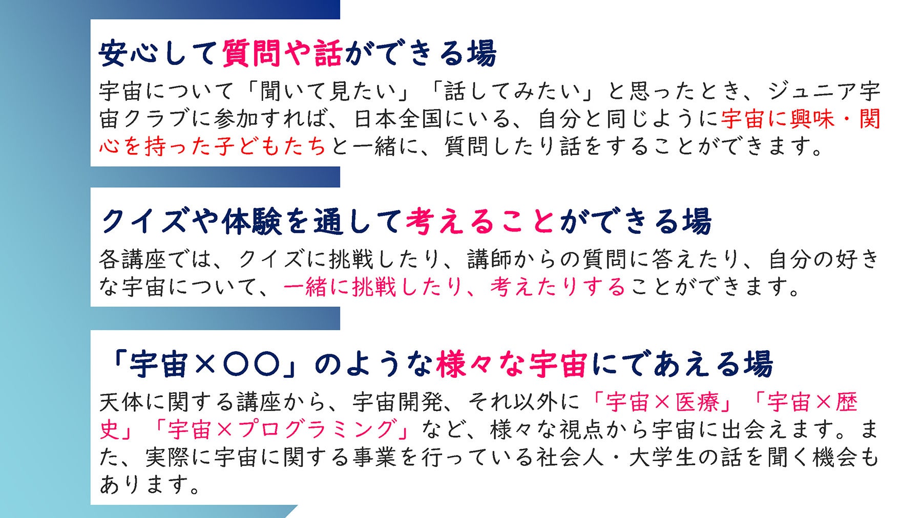 「オンライン ジュニア宇宙クラブ」を通して、「学校とは違う体験」を子どもたちに届けることで、子どもたちの視野を、未来の可能性を広げることで、幸せになって欲しと想い企画しました。
