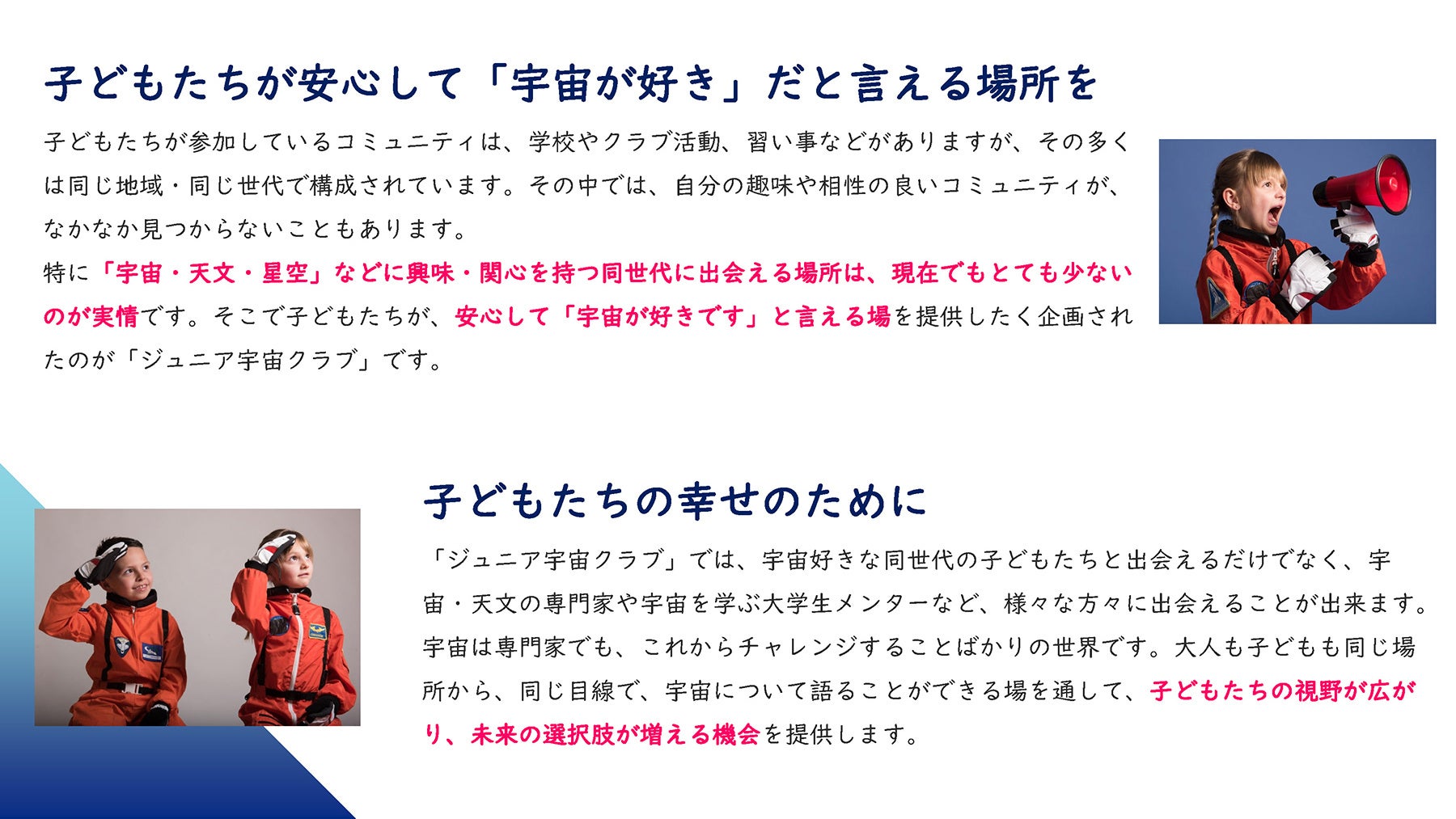 特に「宇宙・天文・星空」などに興味・関心を持つ同世代に出会える場所は、現在でもとても少ないのが実情です。そこで子どもたちが、安心して「宇宙が好きです」と言える場を提供するために企画したのが「ジュニア宇宙クラブ」です。