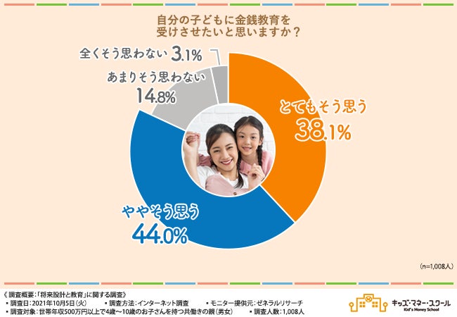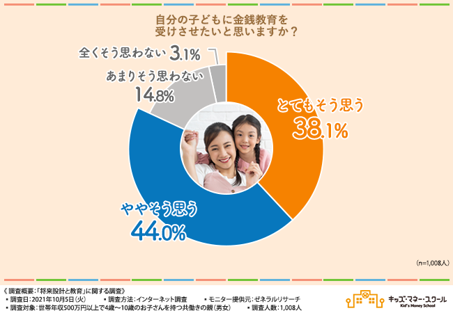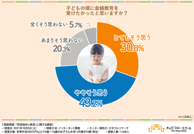 実際に、世帯年収500万円以上で4歳〜10歳のお子さんを持つ共働きの親(男女)1,008名を対象に、「将来設計と教育」に関する調査(※1)を実施したところ、子どもの頃に金銭教育を受けたかったという方が7割という結果に、そして自分の子どもには金銭教育を受けさせたいと思っている方が8割以上いることが分かりました。