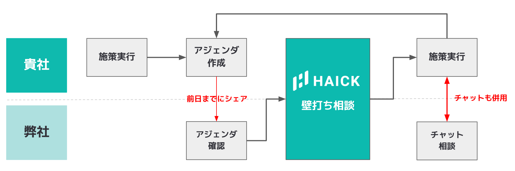 HAICKでは、コンサルティングではなくあくまで「壁打ち」というスタイルでの支援を行います。壁打ちの流れとしては下図のようなイメージとなります。