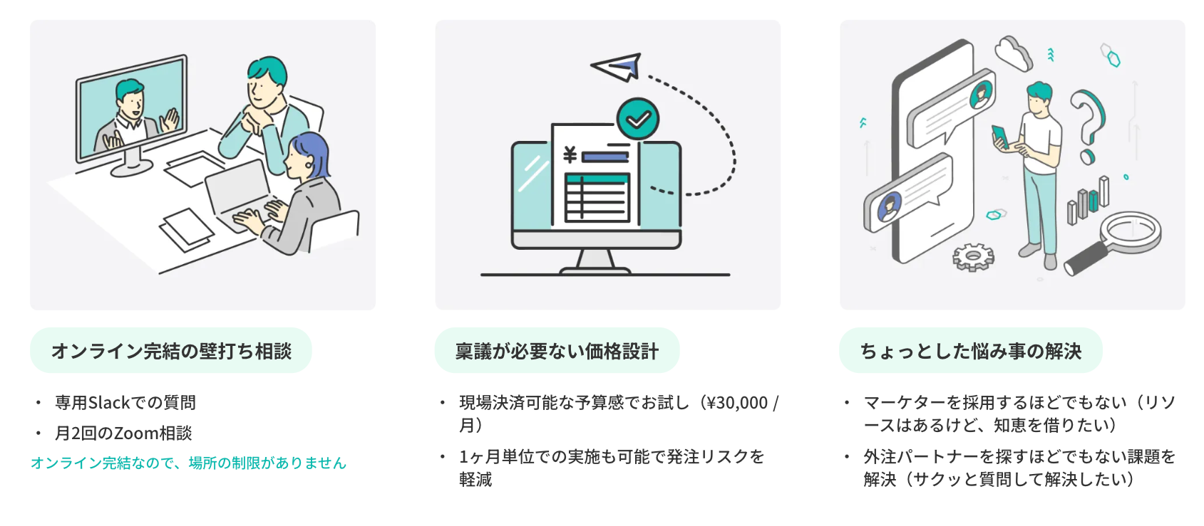 HAICKは、SlackやZoomなどのオンラインツールで、気軽にマーケティング業務について相談ができるサービスです。マーケティング業務の相談パートナーを見つけるのは、見極めがかなり難しいという課題に対し、HAICKでは月額3万円でお試しいただくことで、発注リスクを軽減しながら最適なパートナーを選ぶことができます。