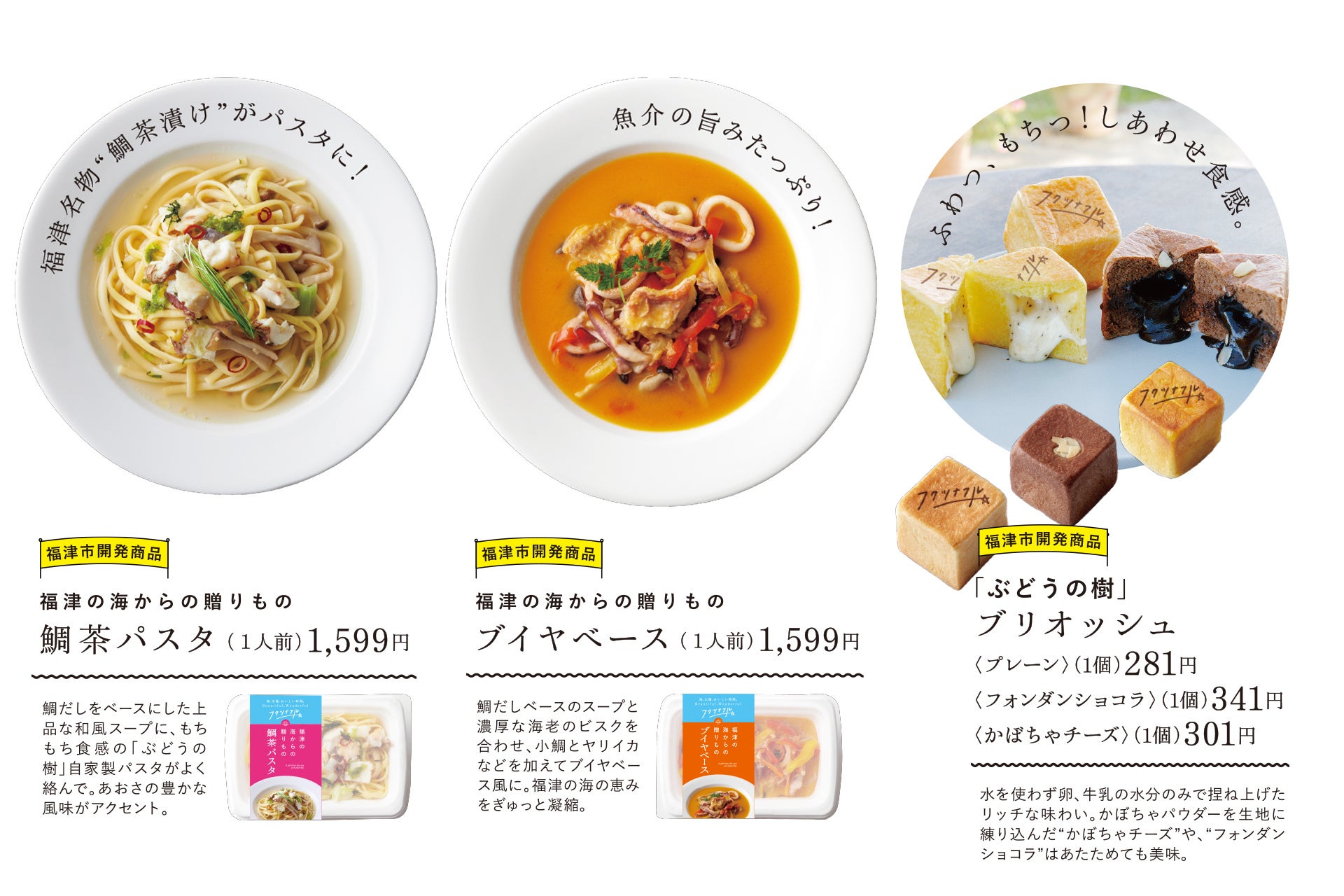 地元の名産品を知り尽くした「地域商社 福津いいざい」と、福津のレストラン「ぶどうの樹」が全面協力。当社が懸け橋となり、福津市にゆかりのある博多阪急スタッフの意見も取り入れながら試行錯誤を重ねて開発した、鯛をはじめ福津産食材の魅力を生かした3つのオリジナルメニューが登場します。