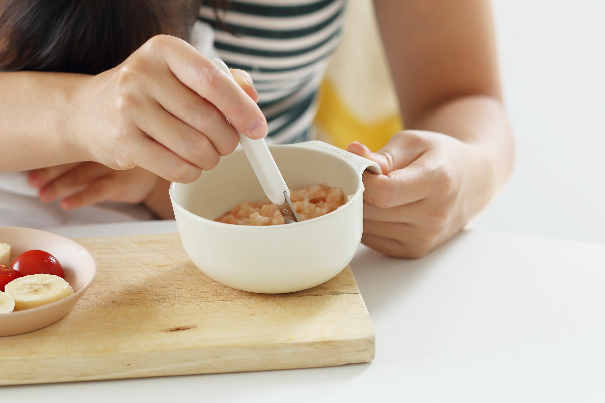 小さなお子様でも左右方向がわかりやすく、持ち手がある方に手を添えて使っていただくことで、ひとりで最後まで食べられるようにサポートします。