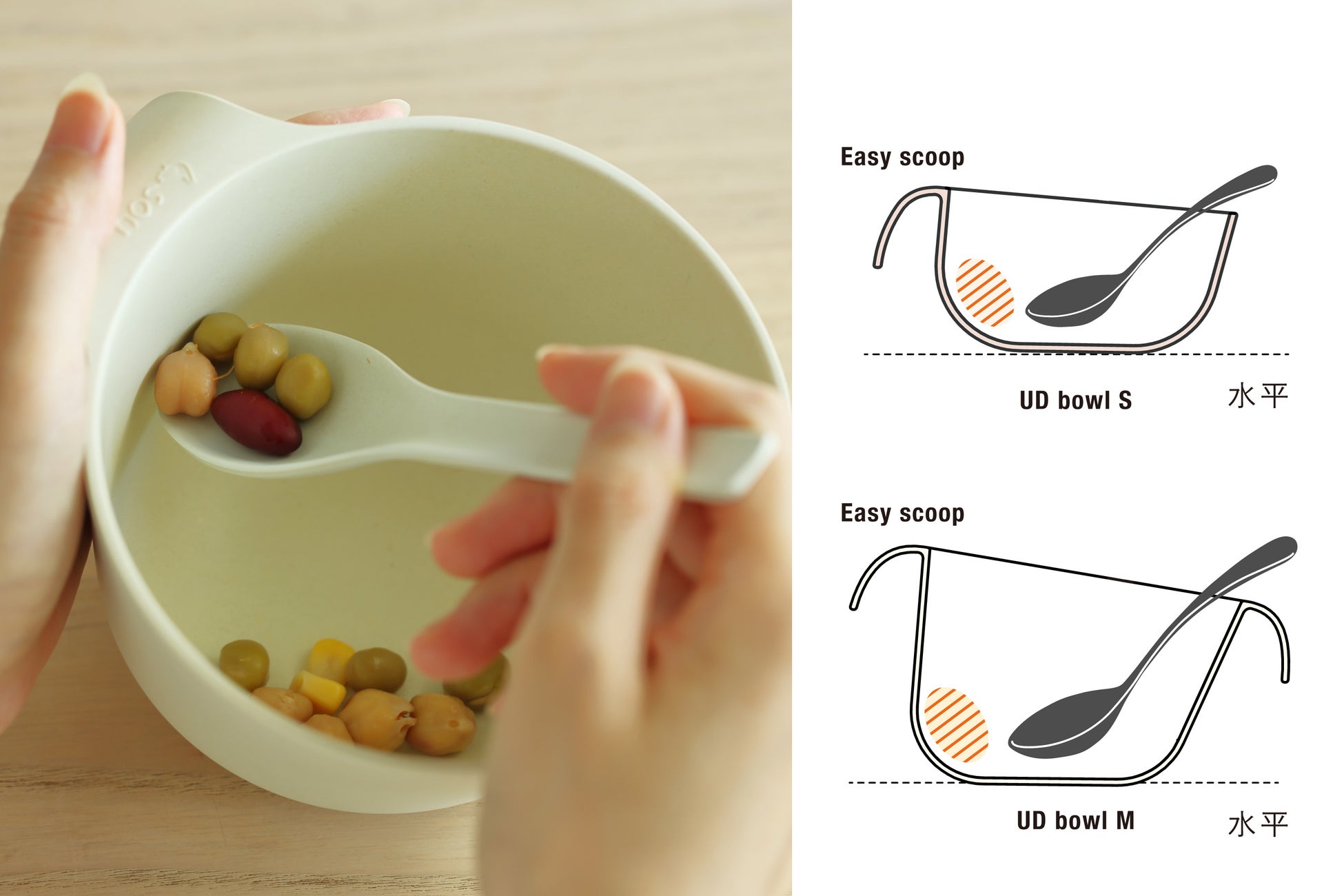 食器の内側には斜めに設計された“返し”があることで、食材がスプーンにのりやすく、最後まですくいやすく食べられる。