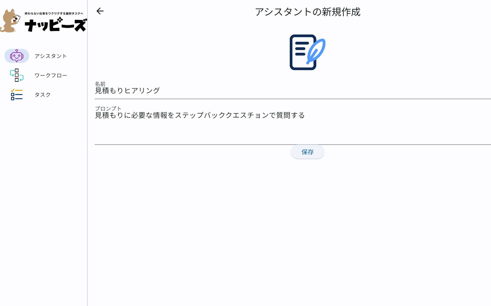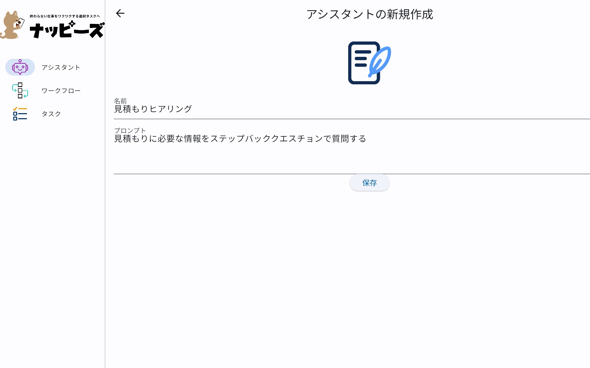 膨大な作業に追われて考える作業に手が回らないそんなお悩みはありませんか?作業はAIへ任せてやりたい仕事に集中できる、ナッピーズは仕事の戦友です。あれやっといて」の一言でAIアシスタントが見積書や提案書を複数の切り口で自動作成!依頼者は作成された提案書をチェックして選択するだけナッピーズはそんな世界を実現します。