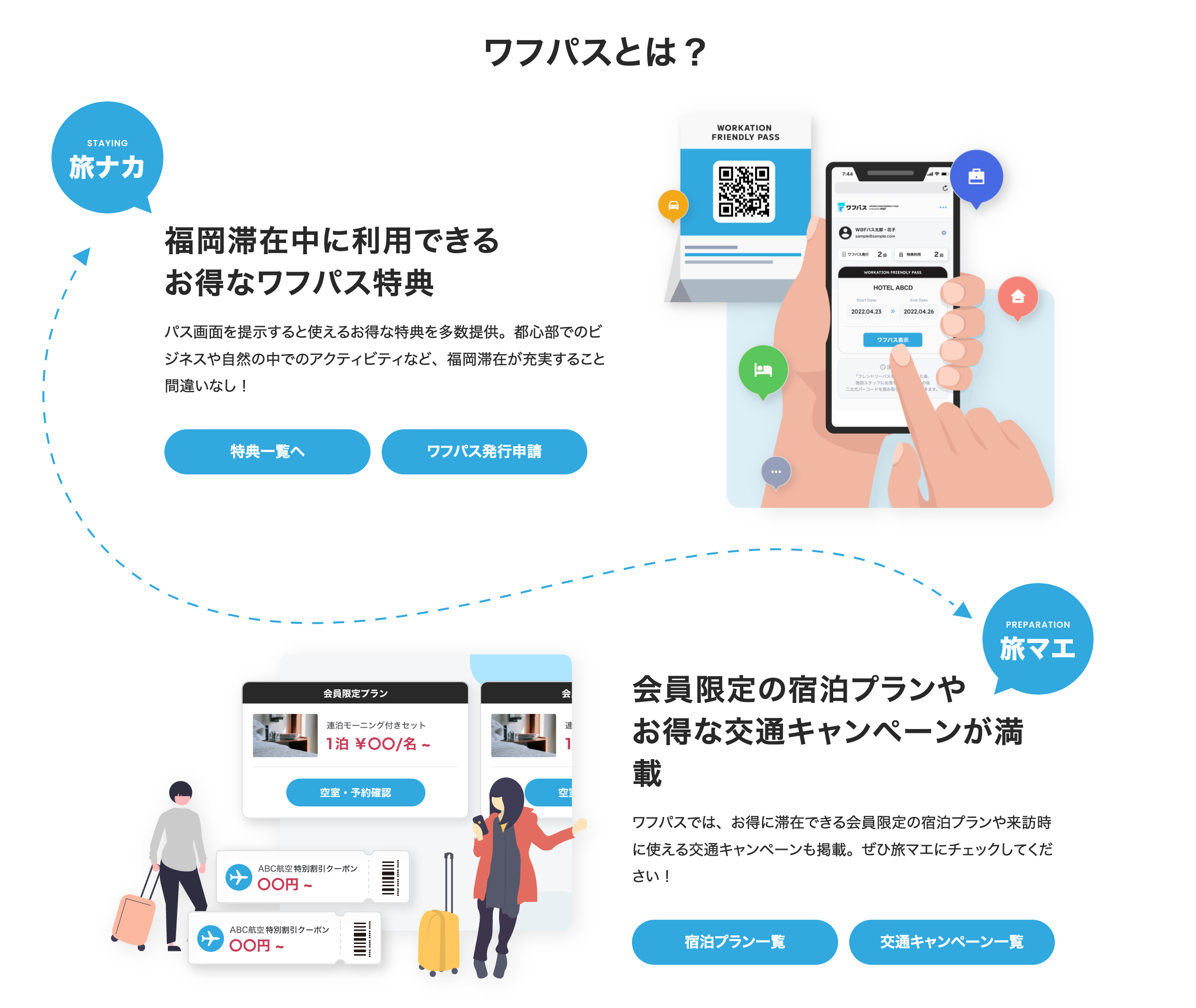 WEBアプリケーション開発、UIUXデザインを行う株式会社MOLE(本社:東京都渋谷区、代表:岡崎友宏)は、福岡市と(公財)福岡観光コンベンションビューローが提供する、ワーケーションポータルサイト「W@F(ワフ)」の連携サービスとして「ワーケーションフレンドリーパス(ワフパス)」を公開しました。