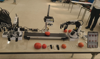 システム構成は、小型ロボットアームDobotMagician2台とコンベアベルト1台、USBカメラで構成され、全体の制御系はRaspberryPiⓇという小型のLinuxボードコンピュータを用いて、ロボット制御、AI(ディープラーニング)を用いた画像処理と外観判定を行うものとなっている。また判定結果はクラウドサーバに逐次アップロードされ、集荷されたトマトに環境情報とともにデータ化され収穫した農作物のトレーサビリティの確保に応用も可能となっている。クラウドシステムはライトカフェにより開発され、クラウドサーバとロボット制御系との統合を実現している。