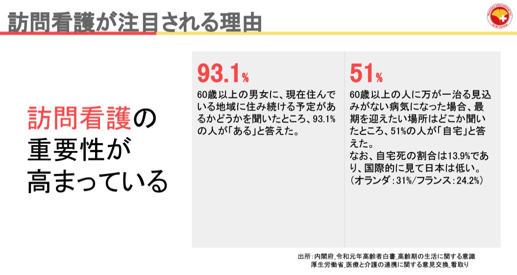 厚生労働省「介護サービス施設・事業所調査の概況」によると、訪問看護師の数は2020年10月時点で約8万人であり、日本看護協会「訪問看護 アクションプラン2025」による在宅死の割合をオランダやフランスなどの水準に引き上げる場合に必要な人数である15万人から大きく不足しております。そのため、訪問看護師不足が課題であります。