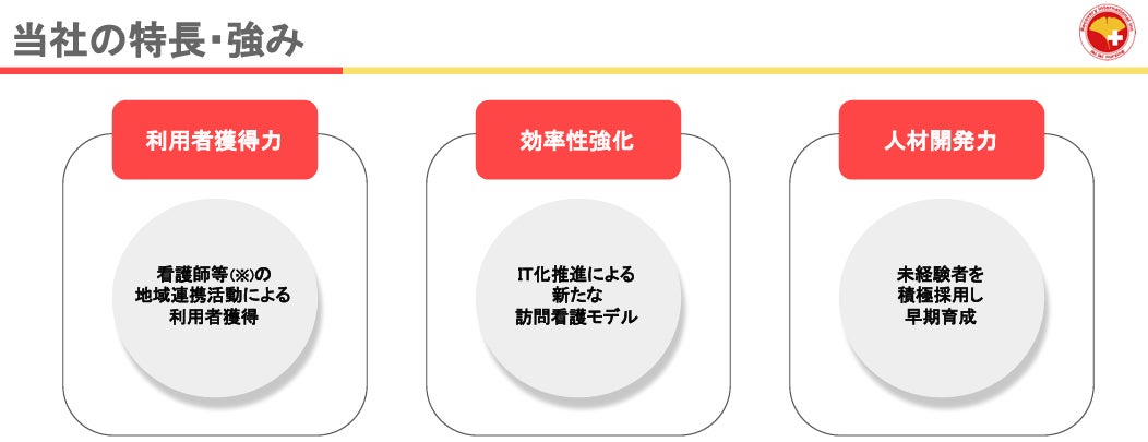 訪問看護人材の不足に対処するため、当社は訪問看護未経験者の積極採用を行っております。当社に入社する看護師等の従前は病院勤務者であることが多く、9割以上が訪問看護未経験者となっております。このため、当社では、早期に1人で利用者様を診ることができるよう、早期育成プログラムを整備しております。未経験者であっても概ね3ヵ月で主担当として、1人で訪問看護ができるレベルまで引き上げる育成プログラムを整備し、看護師等の早期戦力化を図っております。