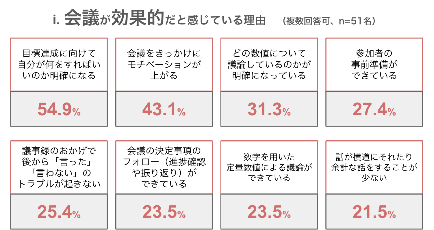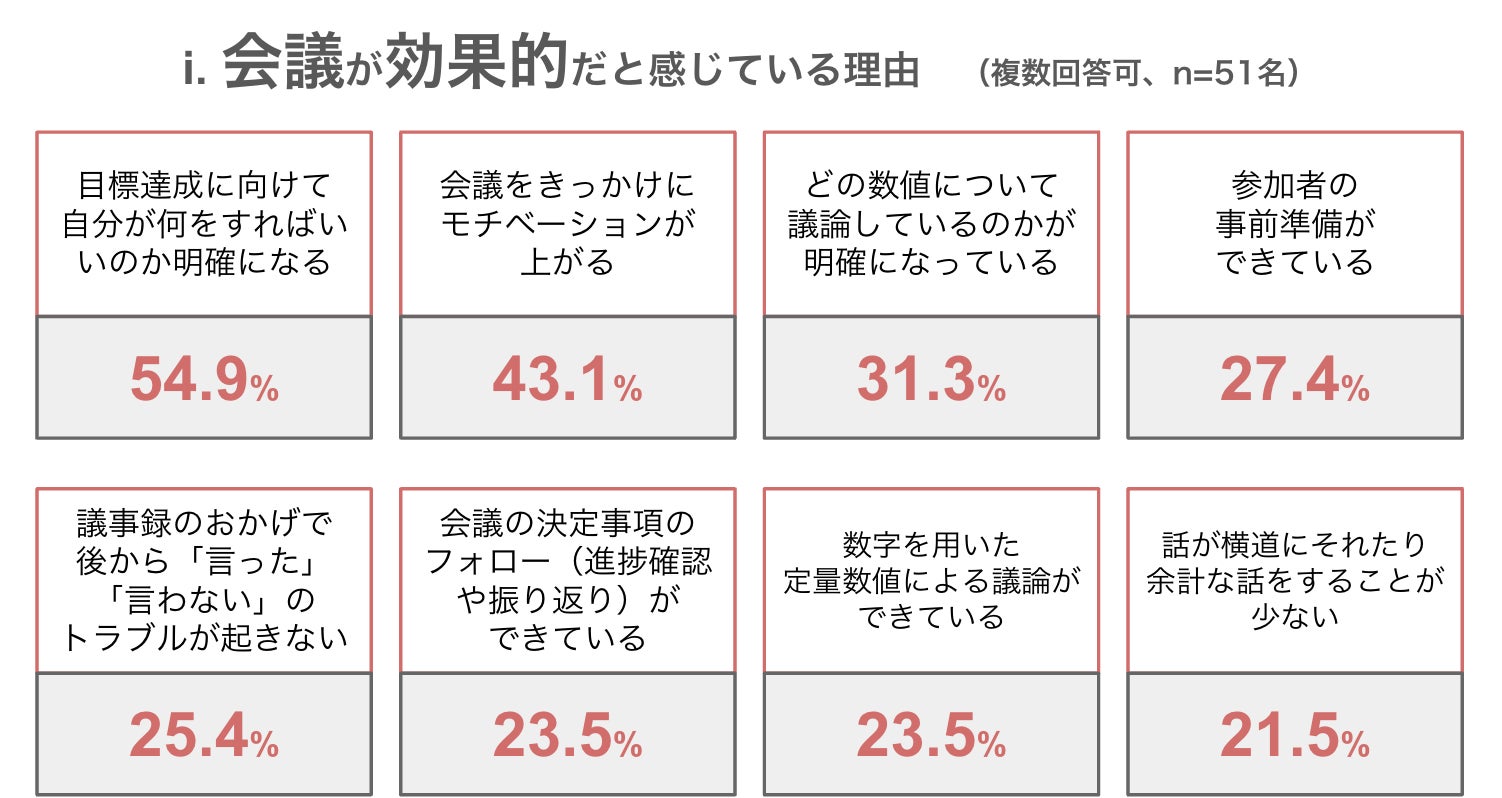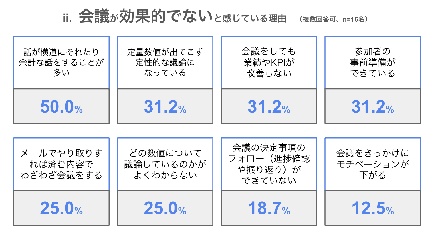 「会議が効果的でない」と回答した16名を対象に、「会議が効果的でないと感じる理由」を聞いたところ、以下の回答を得ました。「話が横道に逸れたり余計な話をすることが多い」「数字があまり出てこずに定性的な議論になってしまっている」「参加者の事前準備ができていない」「会議をしても業績やKPIが改善しない」など、会議の内容への疑問視や、会議によって生まれる業績向上がないことなどが理由として挙げられました。