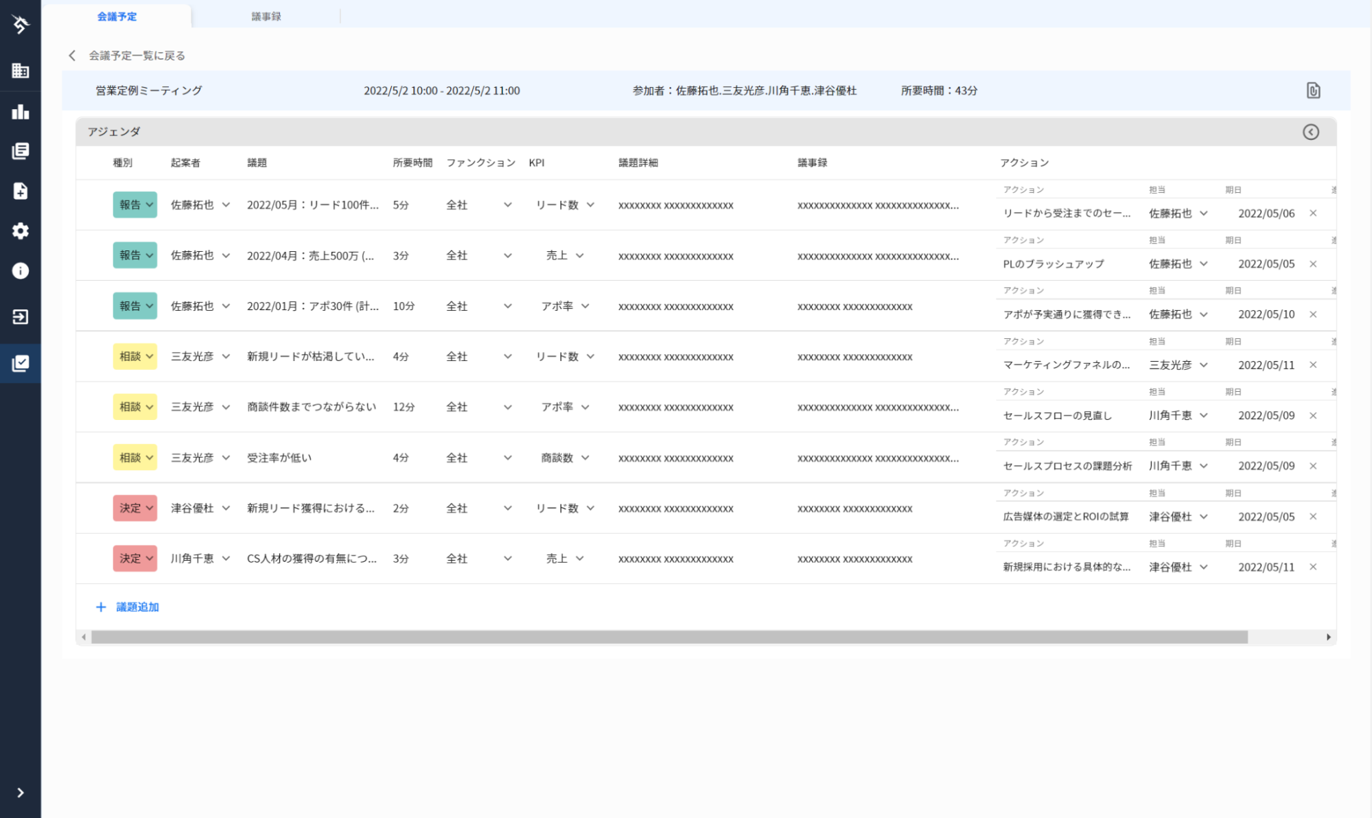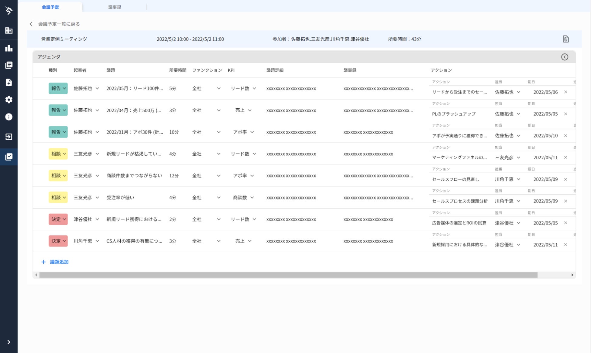 - 会議アジェンダごとに議事録を残すことができ、また、議論して決定したアクション施策やその担当者を各KPIに紐づけることができる点
