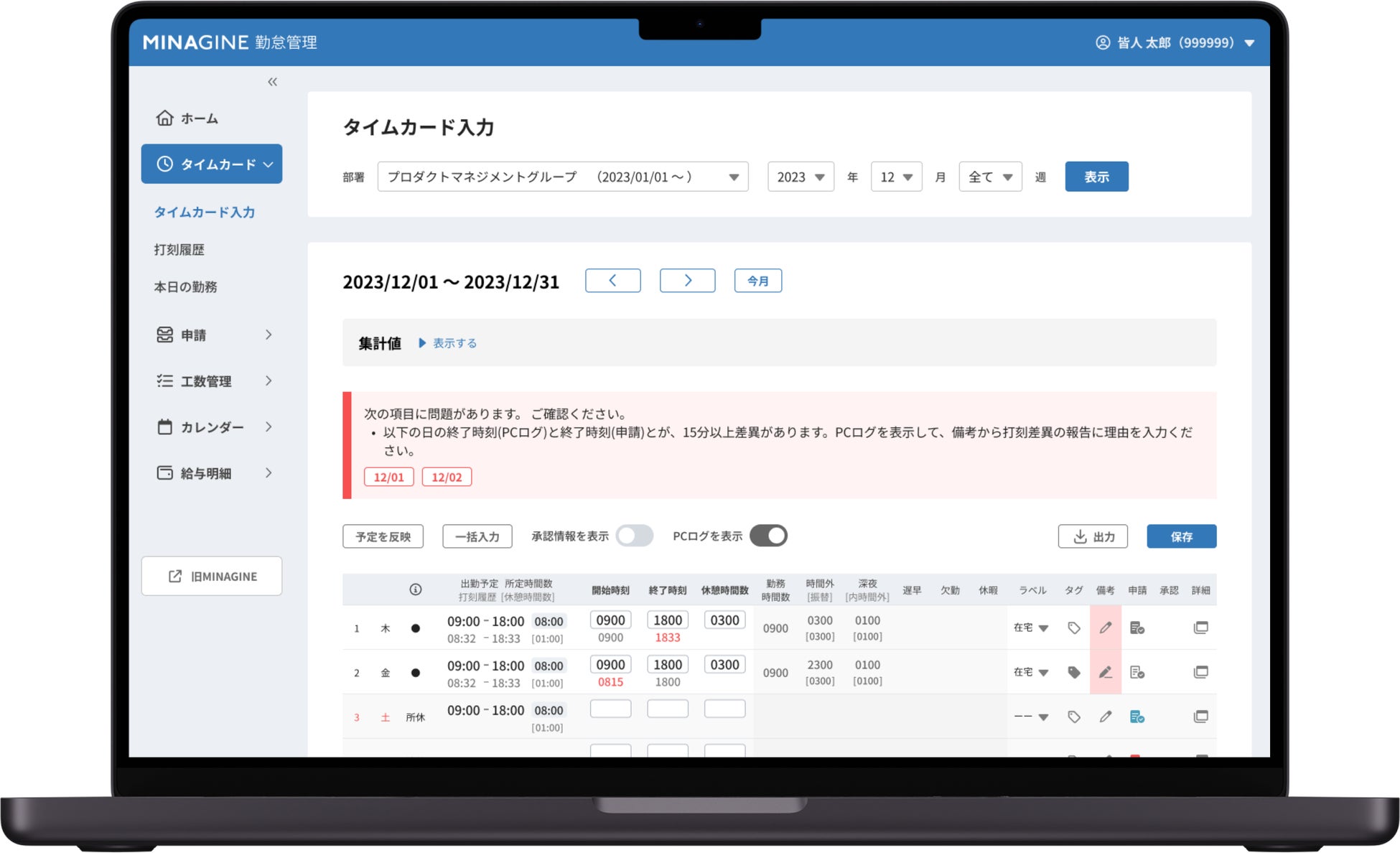新たに追加されたアラート機能では、従業員が予定外に勤務を行った場合や、打刻データとの不一致が発生した際に、タイムカード上にアラートが表示され、対応が求められます。このアラートは従業員本人だけでなく、管理者や上長にも通知されるため、適切なフォローが可能です。