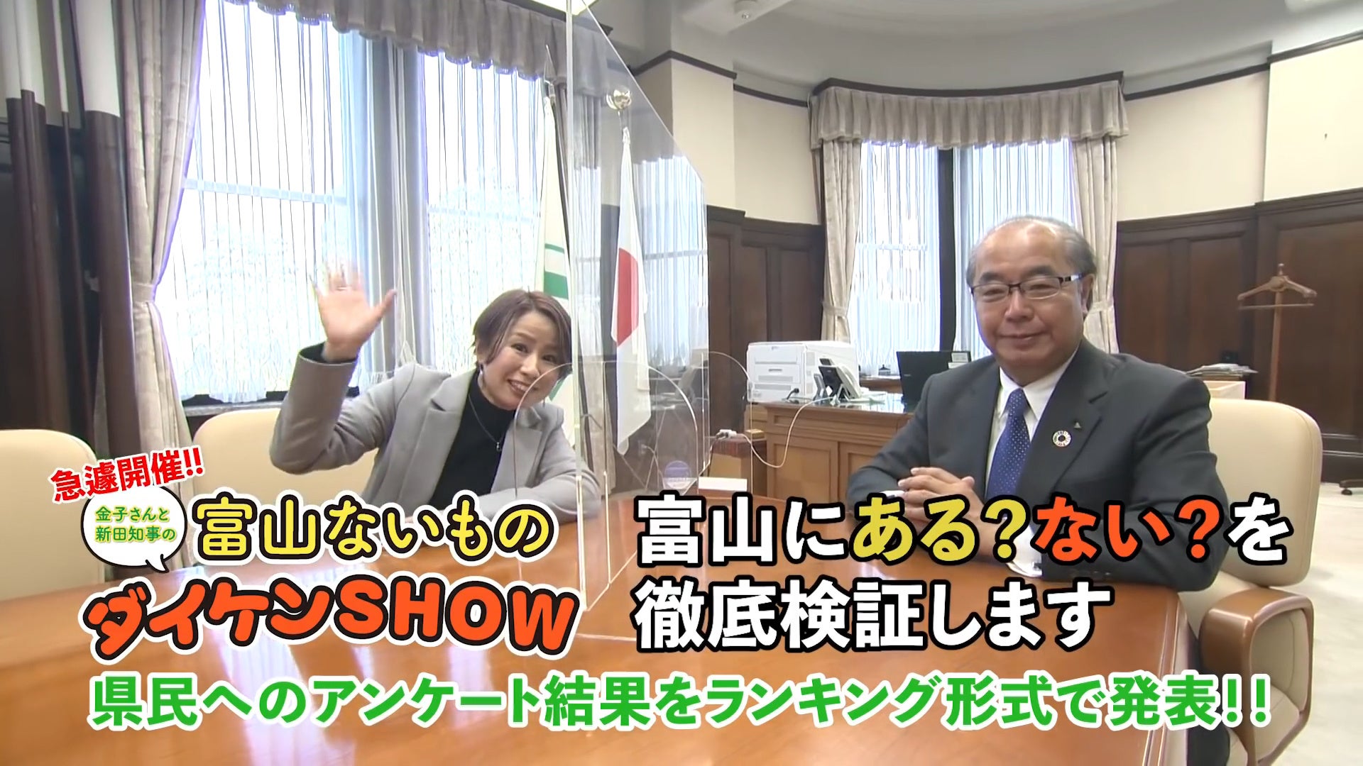 緊張の初対面から金子さんが知事を相手にお悩みトーク炸裂。知事も「富山に魅力がないなんてことはない!」とヒートアップ。富山県民に「富山にないもの」を大募集する展開に。