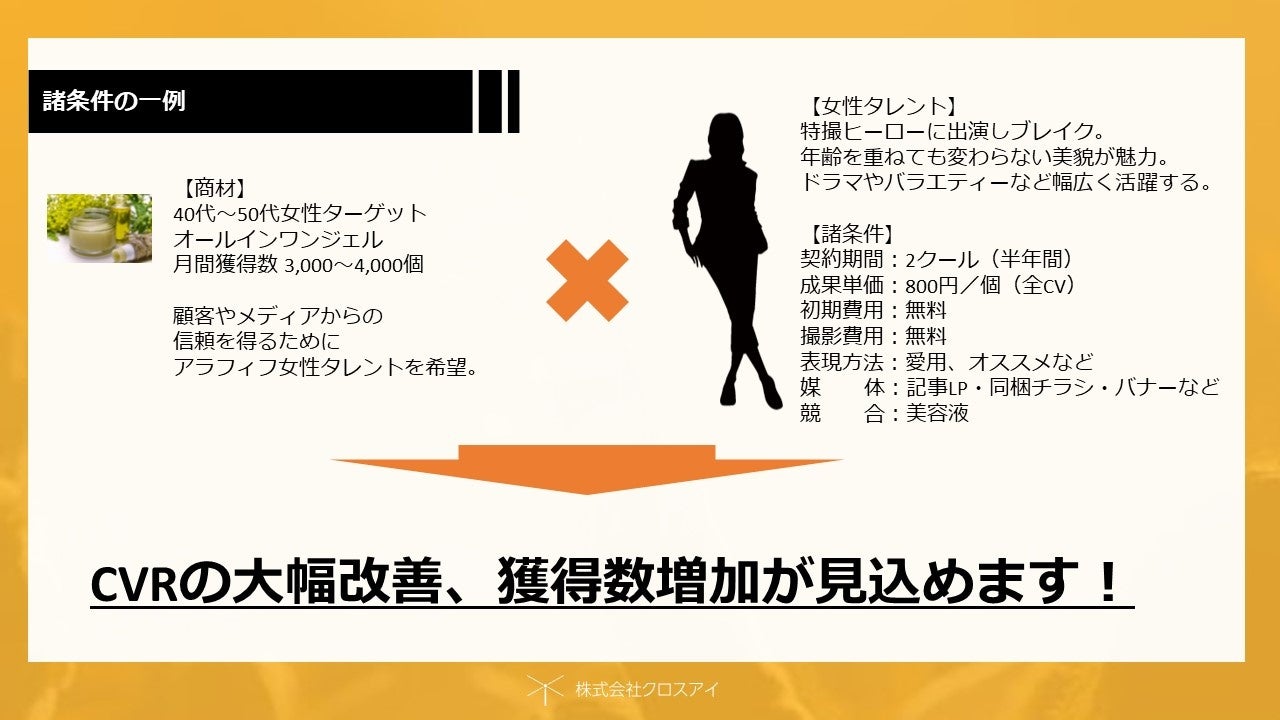 【D2C企業対象】キャスティング会社クロスアイによる初期費用ゼロ円・月額払いによる完全成果報酬制のタレント起用サービス「アフィキャス」。導入企業増に伴うラインナップ追加のお知らせ