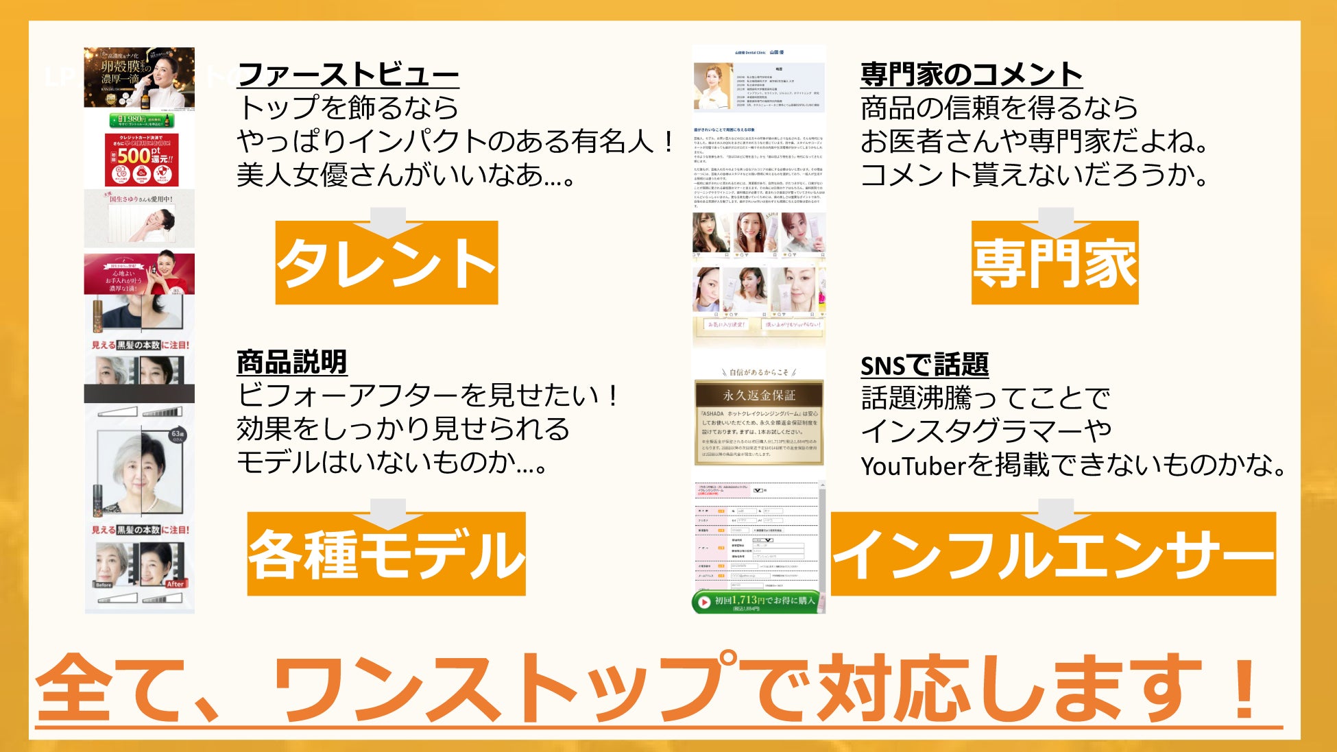 D2Cメーカーを初め、さまざまな企業様の広告へ有名人やインフルエンサー、専門家などの著名人を最適な条件にてご提案いたします。