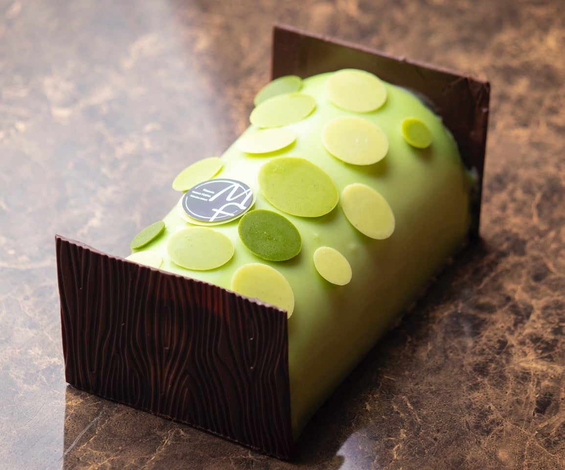 全体にピスタチオの風味を効かせた生地とムースをアクセントにハスカップのジュレを忍ばせました