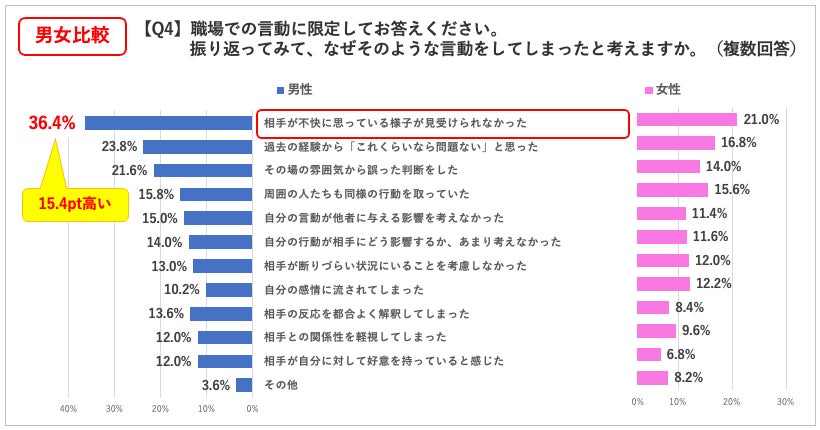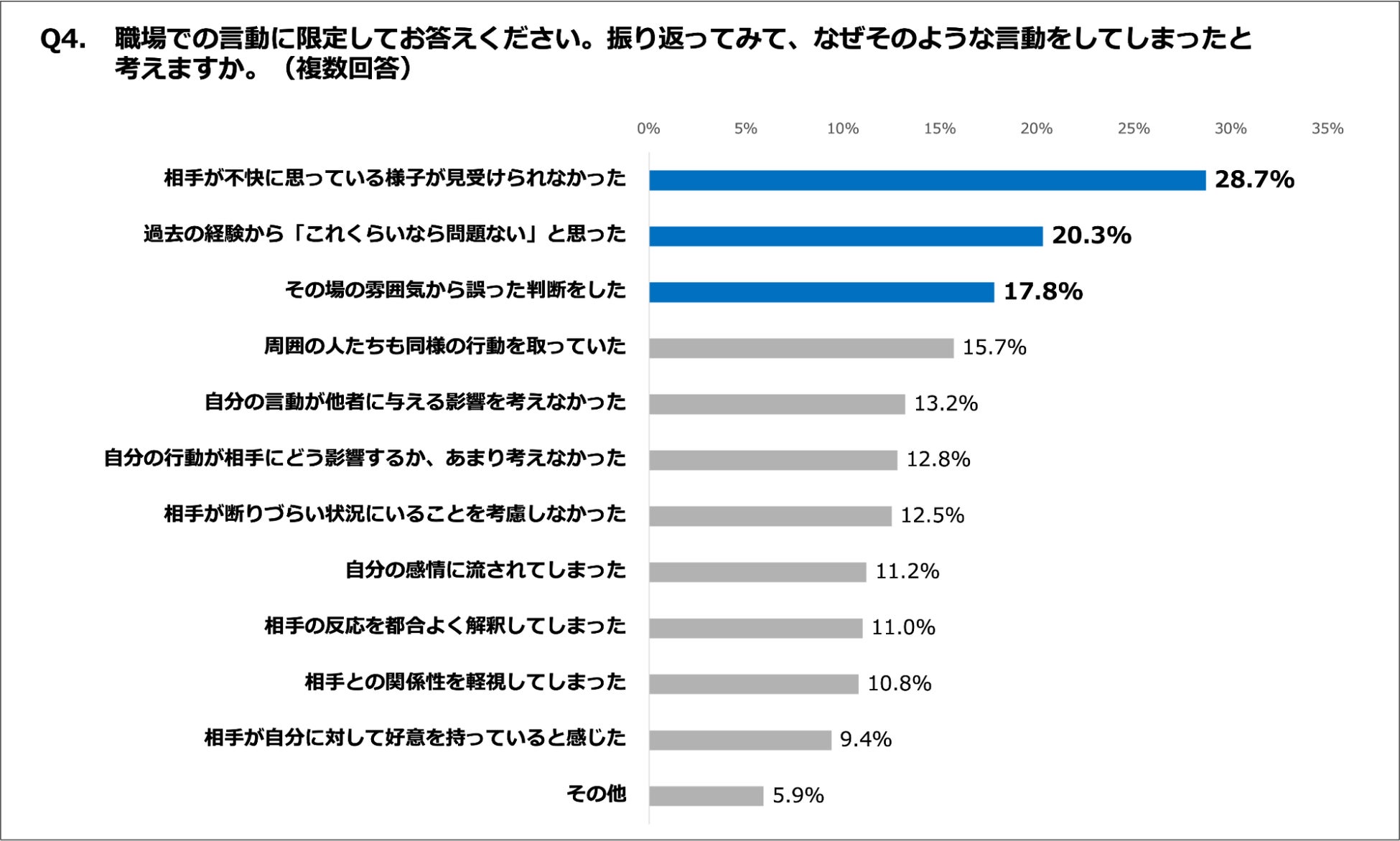 では、なぜそのような言動をしてしまったのでしょうか。(Q4|複数回答|n=1,000)「相手が不快に思っている様子が見受けられなかった」(28.7%)、「過去の経験から「これくらいなら問題ない」と思った」(20.3%)などが全体では上位を占めますが、特に「相手が不快に思っている様子が見受けられなかった」は、男性が女性よりも15.4ポイント高い結果になっており、認識の差が顕著です。
