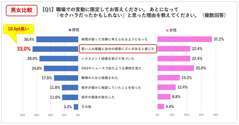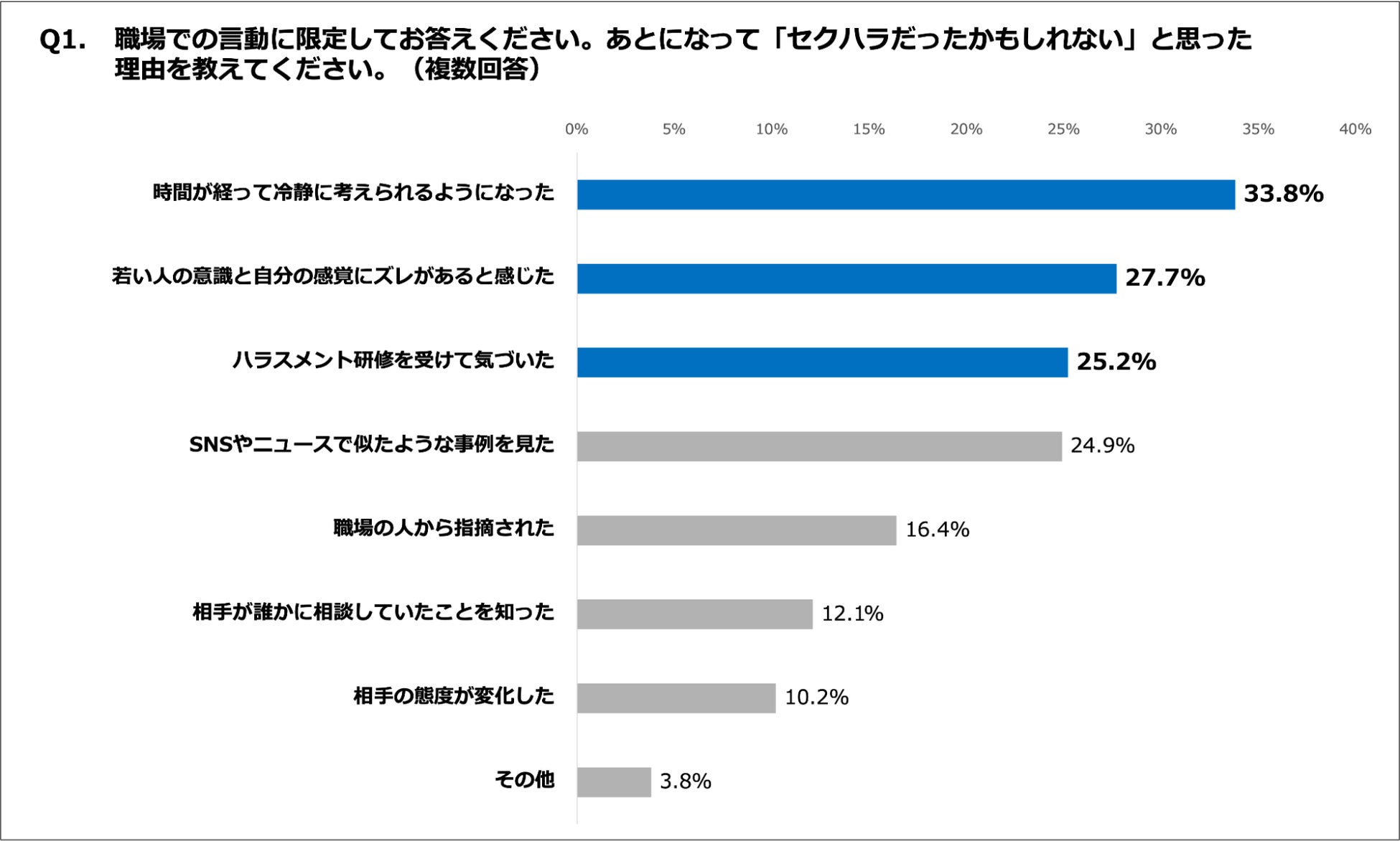まず、職場での言動について、あとになって自分の言動が「セクハラだったかもしれない」と思った理由としては(Q1|複数回答|n=1,000)、「時間が経って冷静に考えられるようになった」が33.8%で最も多く、特に男女間で差が開いた項目は「若い人の意識と自分の感覚にズレがあると感じた」でした(男性が女性よりも10.6ポイント高い結果)。