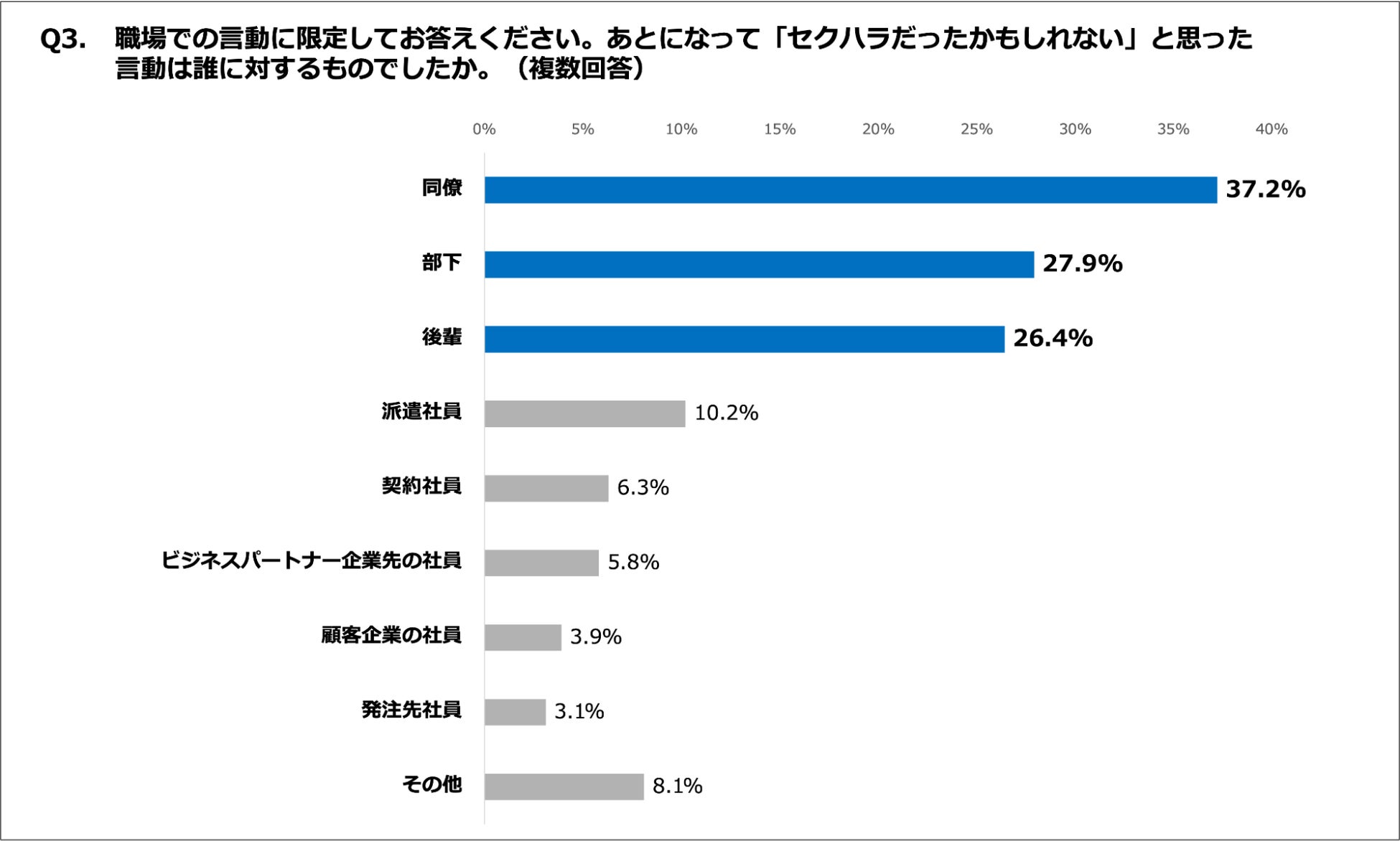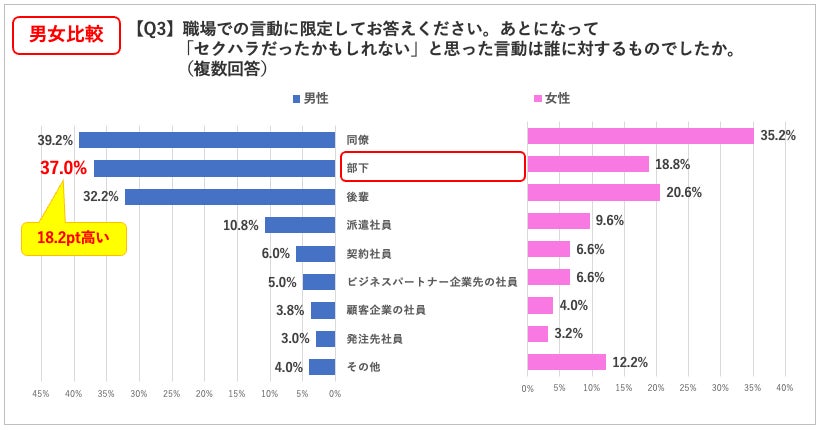 また、その言動をしてしまった相手は、全体では「同僚」が約4割に上りますが、特に男女間で差が開いたのが「部下」に対してで、男性は女性よりも18.2ポイント高い結果となりました。(Q3|複数回答|n=1,000)