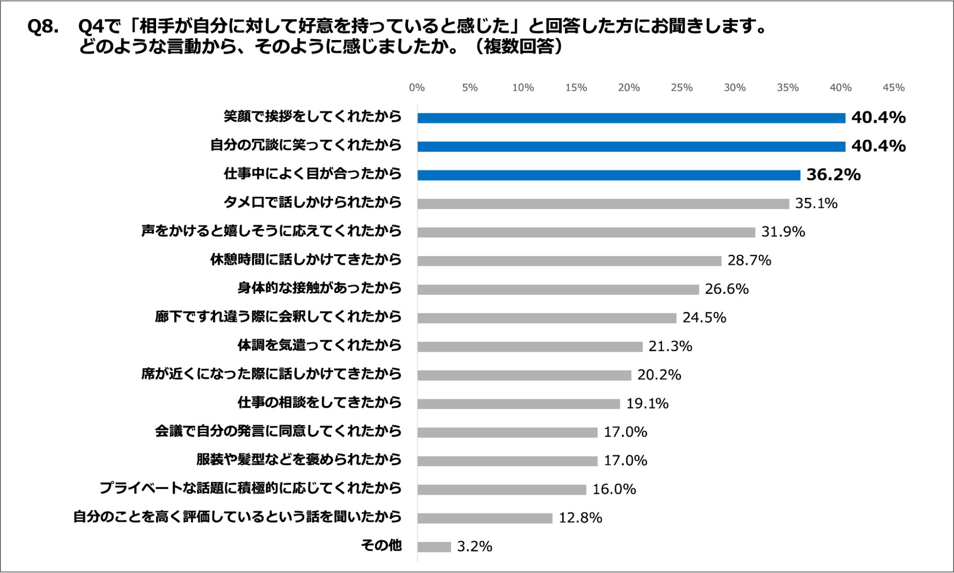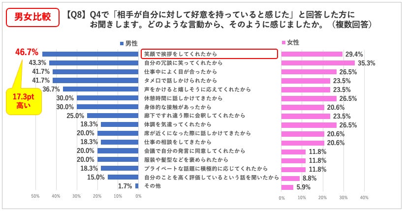 そこで、Q4で「相手が自分に対して好意を持っていると感じた」と回答した方に、どのような言動から、そのように感じたか聞いてみました(Q8|複数回答|n=94)。特に、職場に限らず、社会人として当たり前の項目で最も男女間の差が開いており、「笑顔で挨拶をしてくれたから」(男性:46.7%、女性:29.4%)が17.3ポイント男性が高いという驚くべき結果が明らかに。他にも、「仕事中によく目が合ったから」(男性:41.7%、女性:26.5%)で、男性の方が15.2ポイント高く好意として捉えている実態があるようです。