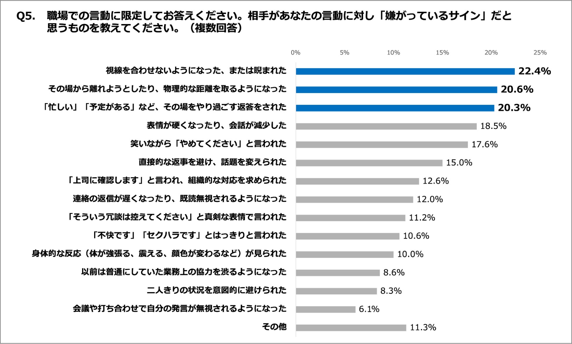 それでは、相手があなたの言動に対し「嫌がっているサイン」(Q5|複数回答|n=1,000)は、どのように読み取れば良いのか。全体では、「視線を合わせないようになった、または睨まれた」(22.4%)、「その場から離れようとしたり、物理的な距離を取るようになった」(20.6%)、「「忙しい」「予定がある」など、その場をやり過ごす返答をされた」(20.3%)といった言動を嫌がっているサインとして捉えている方が多い結果となり、男女間でも大きな差は見られませんでした。