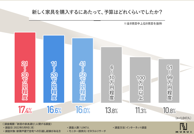 - 家具の購入予算として20万円代が1位、次いで10万円台、40万円台