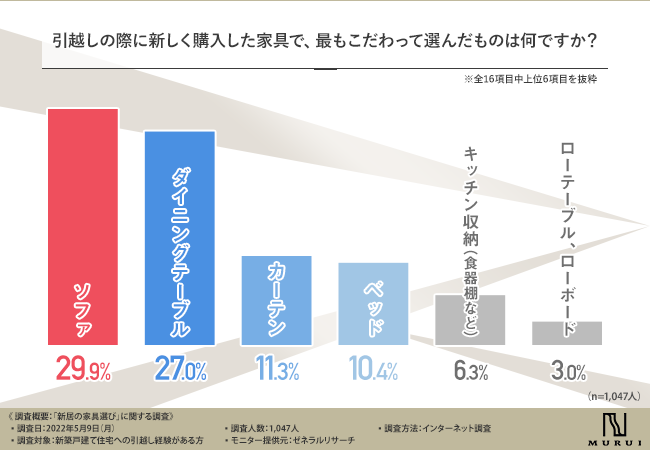 そこで今回、実際に新築戸建て住宅への引越し経験者に「家具選び」について調査したところ、最もこだわりをもって選んだ家具や家具選びの際に重視しているポイントが明らかになりました。