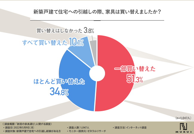 戸建て住宅への引越し事情について調査を行ってみると、新たに家具を購入する方が多くいることが分かりました。
