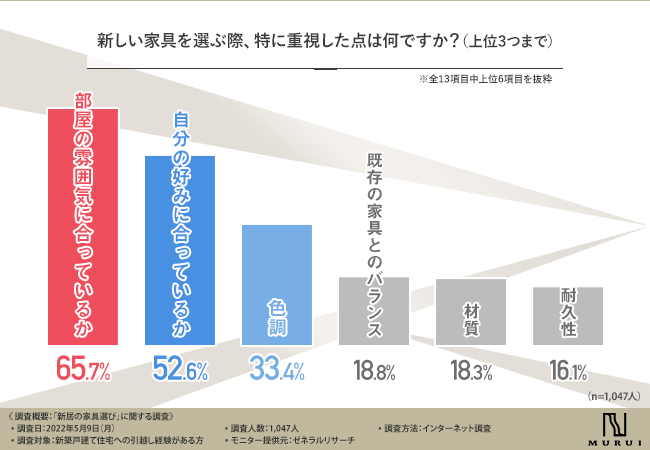 さらに、家具選びは「部屋の雰囲気」を重視する方が6割という結果