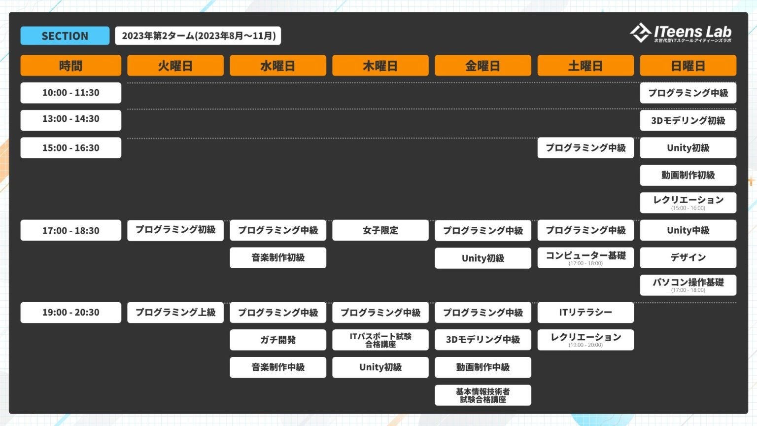 ITeens Labでは、基本的なプログラミングのコースだけではなく、Unityクラスやデザインクラス、音楽制作クラスなどプログラミングと相乗的に活用できるスキルの習得環境を整えてきました。