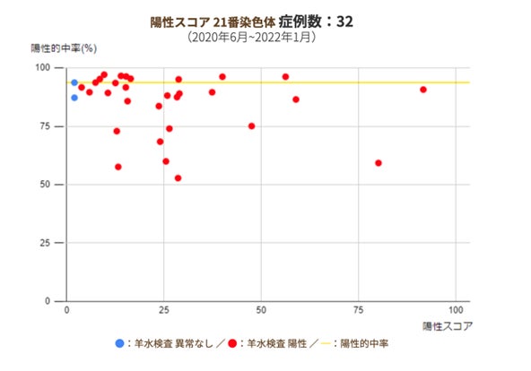 上図の赤の点は当院のNIPT検査で陽性かつ羊水検査が陽性だった人を指します。一方青の点は当院のNIPT検査で陽性かつ羊水検査が陰性だった人を指します。グラフ上、右側にいくほど陽性スコアが高くなります。青の点は左側に多く(陽性スコアが低い)、わずかながらも偽陽性となっております。