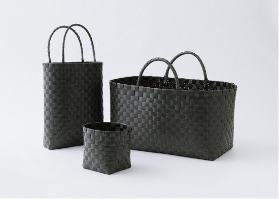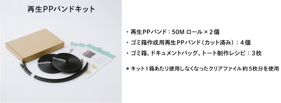 「再生PPバンドキットloop+loop(ループリループ)」は、使用しなくなったクリアファイルをPPバンドにリサイクルし、必要なものを自ら生みだせるキットです。小ぶりなドキュメントバッグ、大きめのトートバッグ、捨てられるゴミの量を制限するためにあえて小さく作るゴミ箱など、自分の手で自由に制作することができます。