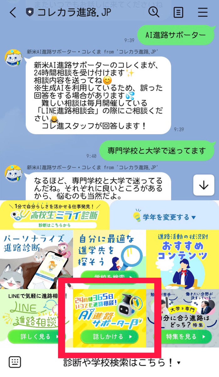 ②リッチメニューから「AI進路サポーターβ」をタップ(1枚目画像の赤枠部分)