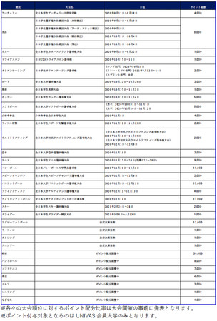 ・該当指定大会の順位に応じて各大学は UNIVAS ポイントを獲得、指定大会合計でのポイント獲得総数によって大学総合順位を決定します。
