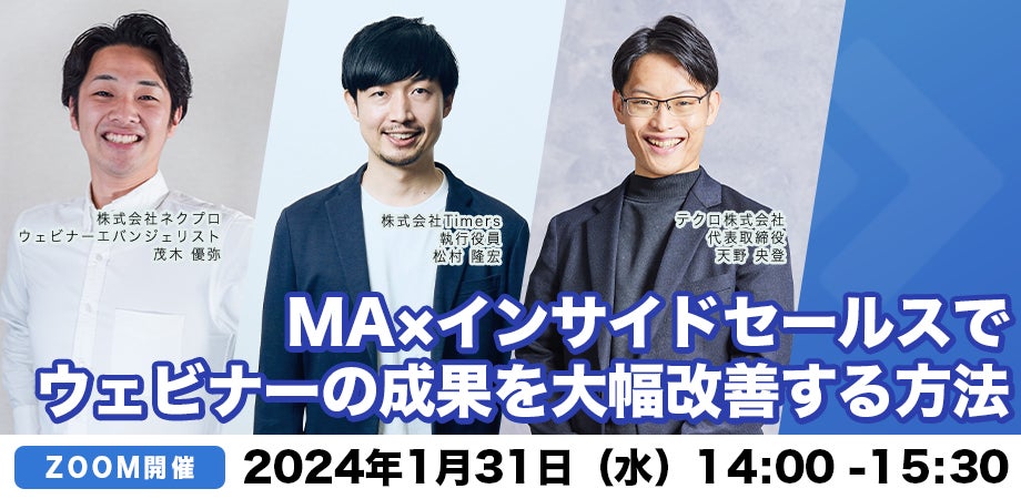テクロ株式会社(本社:東京都渋谷区、代表取締役:天野央登、以下「当社」)は、株式会社ネクプロ(本社:東京都千代田区、代表取締役:尾花慎也)、株式会社Timers(本社:東京都渋谷区、代表取締役:田和 晃一郎)とともに、「MA×インサイドセールスでウェビナーの成果を大幅改善する方法」をテーマに1/31(水)14:00より、参加費無料のウェビナーを開催します。※お申込みフォームはこちら〈 https://techro.co.jp/webinar/maandinsidesales/ 〉