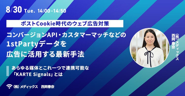 株式会社メディックス(本社:東京都千代田区、代表取締役:田中正則)は、webマーケティングのご担当者様・事業責任者様向けに オンラインセミナー「<ポストCookie時代のウェブ広告対策>コンバージョンAPI・カスタマーマッチなどの1stPartyデータを広告に活用する最新手法~あらゆる媒体とこれ一つで連携可能な「KARTE Signals」とは~」を開催いたします。