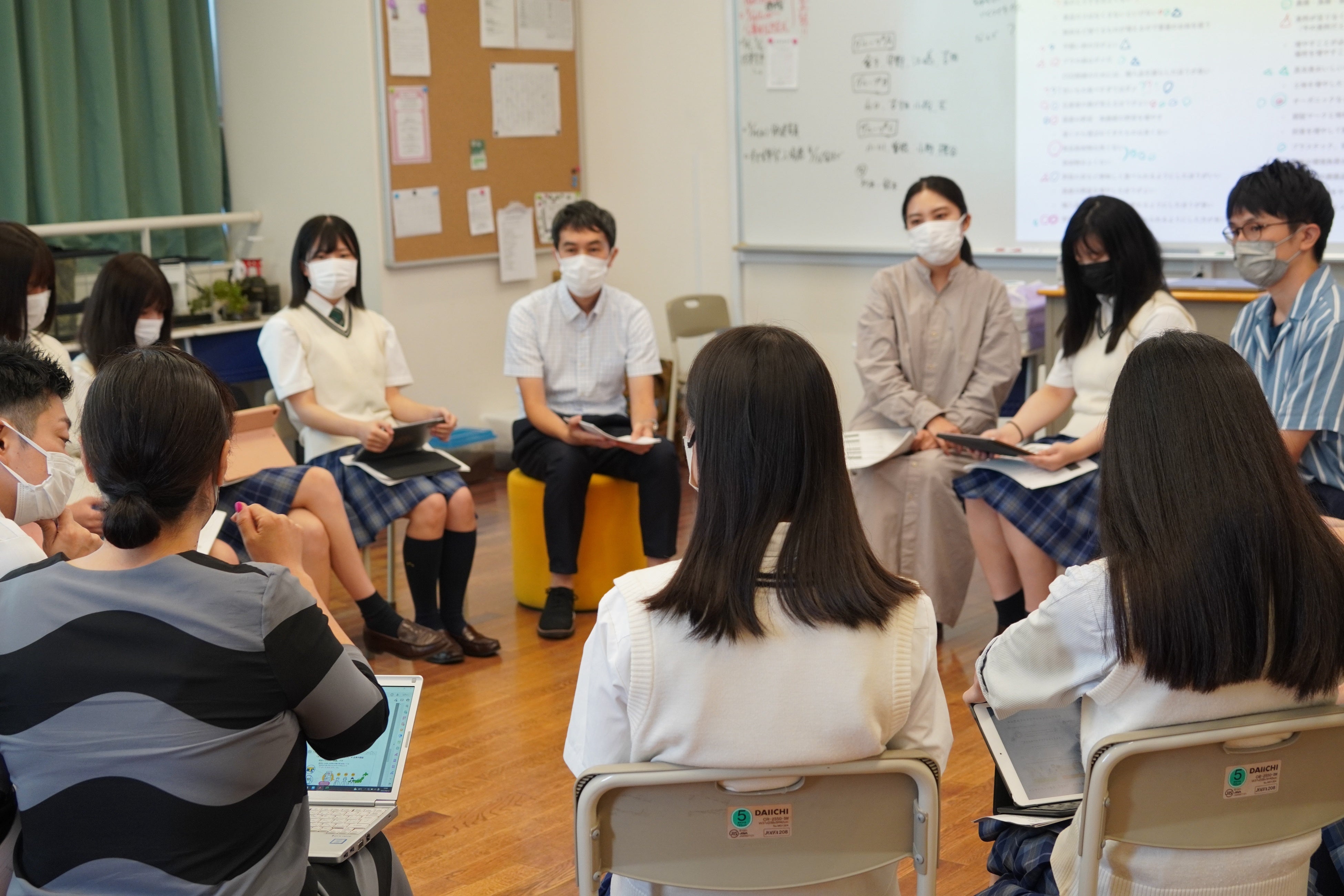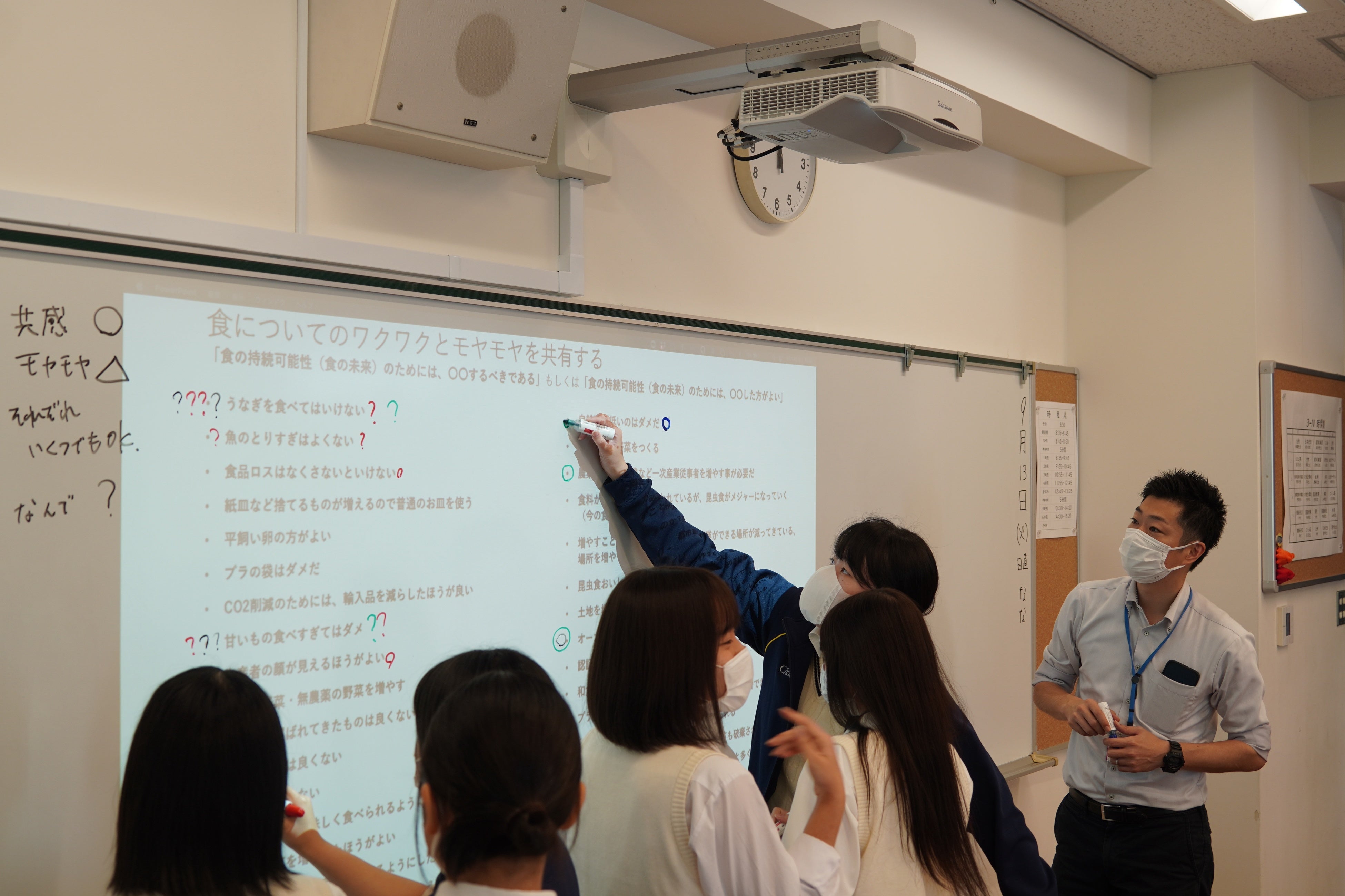 「Tカードみんなのエシカルフードラボ」のメンバーから、ラボの取り組み紹介や、エシカルフードアクションの浸透における課題や悩みについて説明。生徒とラボのメンバーが、「食の持続可能性(食の未来)のために、世の中で ”正しい” とされていること」について意見を出し合い、ワクワクすることやモヤモヤすることを1人ずつ共有し、なぜモヤモヤするのか対話を行いました。最後にエシカルフードアクションを浸透させていくためには、自分がどのように関わっていくことができるのか、何が必要なのかについて議論を重ねました。
