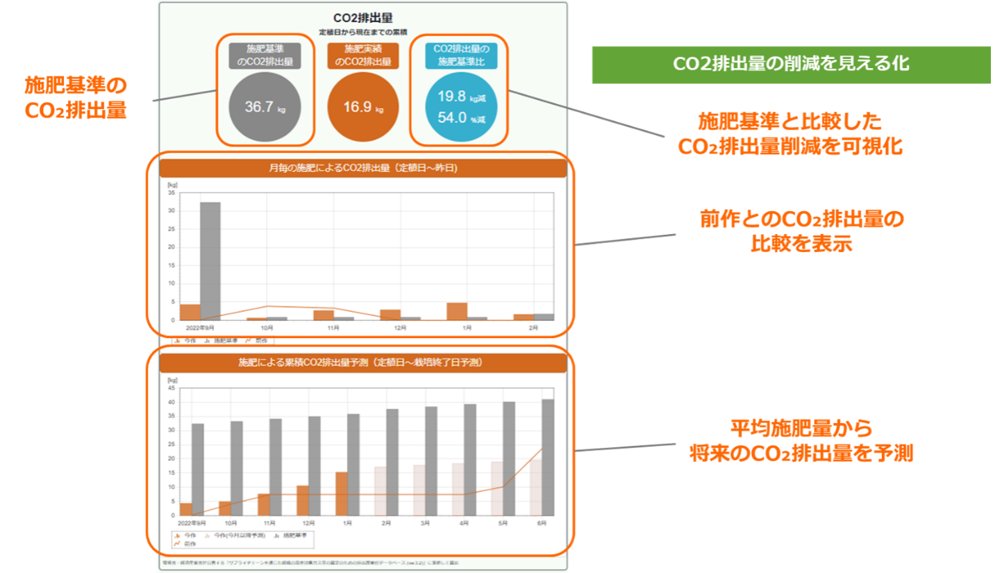 上記の施肥量からCO₂排出量を自動計算(※3)し、施肥量によるCO₂排出量を見える化できるようになりました。施肥量と同様にCO₂排出量に関しても、慣行基準との比較、前作との比較、平均施肥量から将来発生するCO₂排出量の予測についてもグラフ上で確認することが可能です。