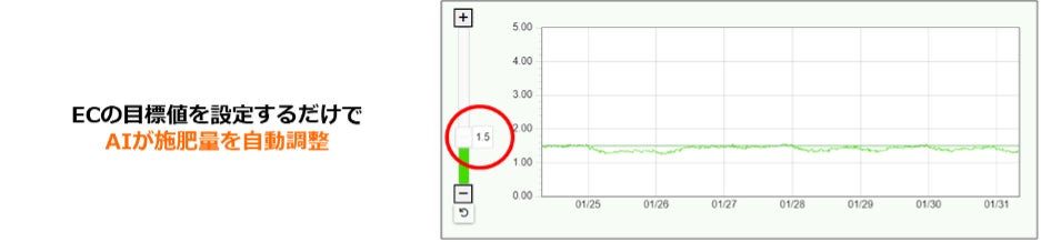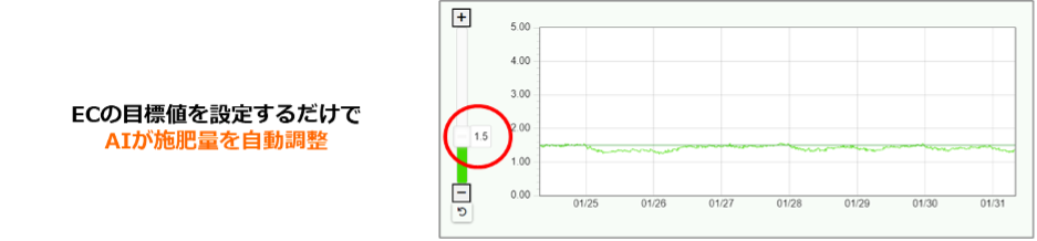 土壌センサで計測したEC(※1)の目標値を設定することで、AIが作物に必要な施肥量を自動で制御、供給をすることが可能になります。これにより多施肥(※2)を防ぎ、化学肥料の低減につなげることが可能です(青森県では施肥量比較で83%減肥、茨城県ではコスト比較で67%減肥の実績あり)。