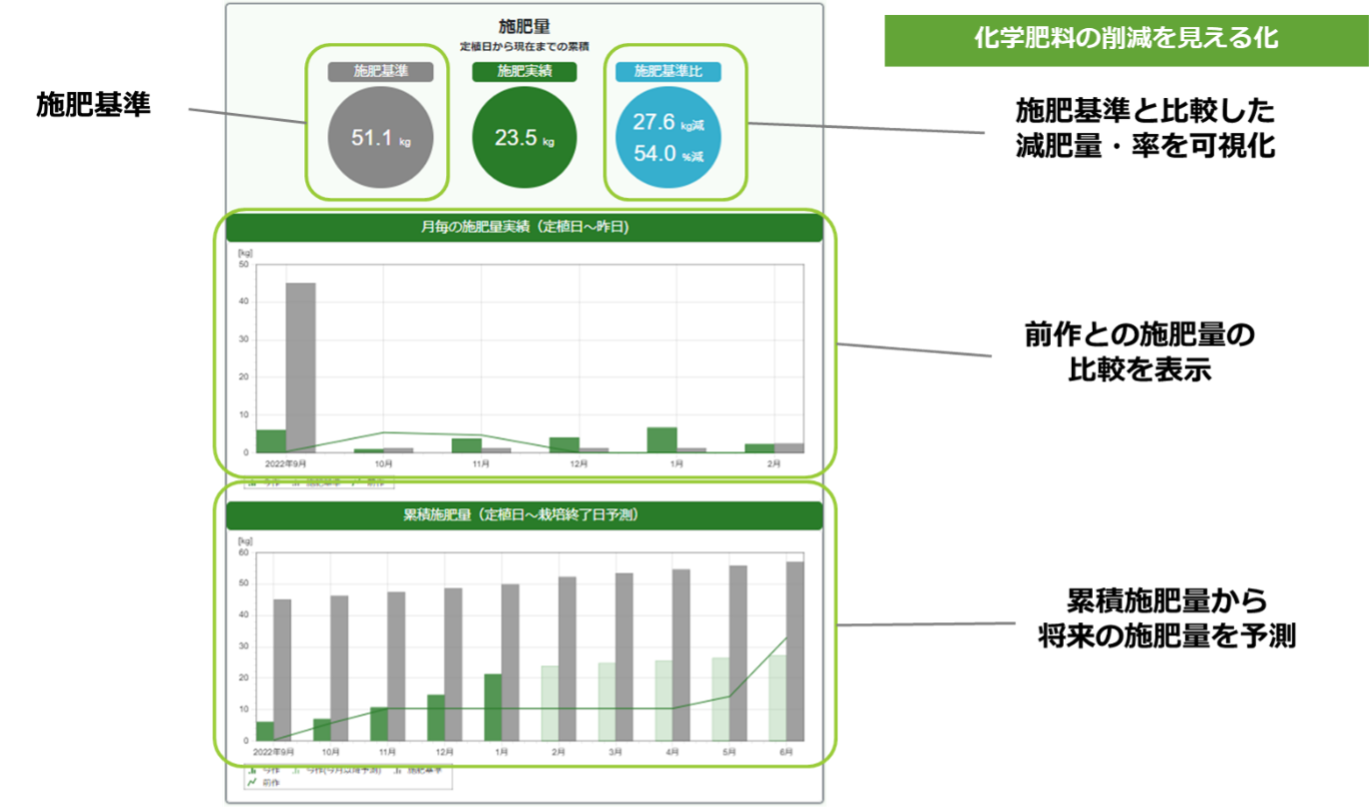 ゼロアグリは、いつどれだけ施肥したかをデータベースに蓄積しております。各地の作物や作型における施肥基準を登録することで、実際の施肥量と施肥基準を比較した結果を定量的にグラフでも確認できます。また、前作のデータがあれば、前作の施肥量と比較した結果を見ることも可能です。平均施肥量から将来的に使用される施肥量を予測、グラフ上で確認することもできます。