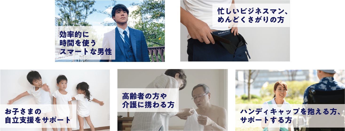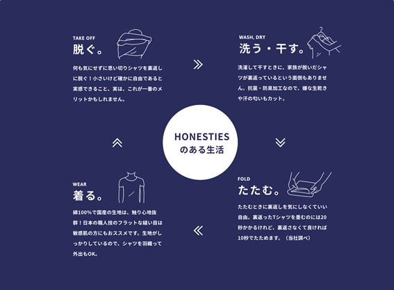 HONESTIES SKYは裏表前後をなくすこと「考えずに脱ぐ!着る!たたむ!」ができ、時短やイライラを解消できる画期的な機能性肌着です。特に忙しい子育て世代のママパパや、ハンディキャップのある方の負担を解消する製品です。