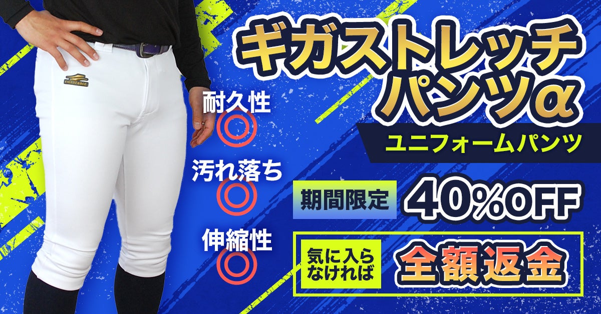 ギガストレッチパンツαはその履き心地から非常に好評をいただいており、自社オンラインショップの販売ランキングでは1位となっているパフォーマンスアップギアです。その履き心地を1人でも多くの野球人にお試しいただきたいという思いから、各サイズ計1,000枚限定で40%引きにて購入できるモニターキャンペーンを開催いたしました。2回目以降購入時には1枚5%OFF/2枚10%OFF/3枚20%OFFで購入できる特典付きで半永久的にお得に購入が可能です。