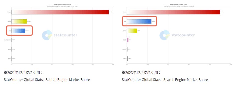 ビジネスシーンでの利用が多いMicrosoft製品のため、BtoB商材のパフォーマンスが発揮されやすく、BtoC市場でも可能性を秘めています。国内のデスクトップにおける検索シェアは2022年から拡大傾向です。 Bingのシェア拡大施策としてBingで検索するとポイントが貯まり、Amazon や UberEats のギフト券に交換できるプログラムも 実施している。1年間で数百万人の新規ユーザーの登録があるなど 今後も拡大する可能性が高いです。
