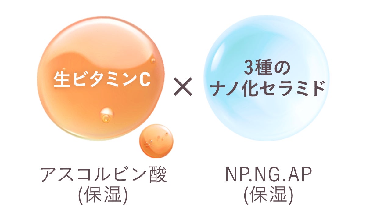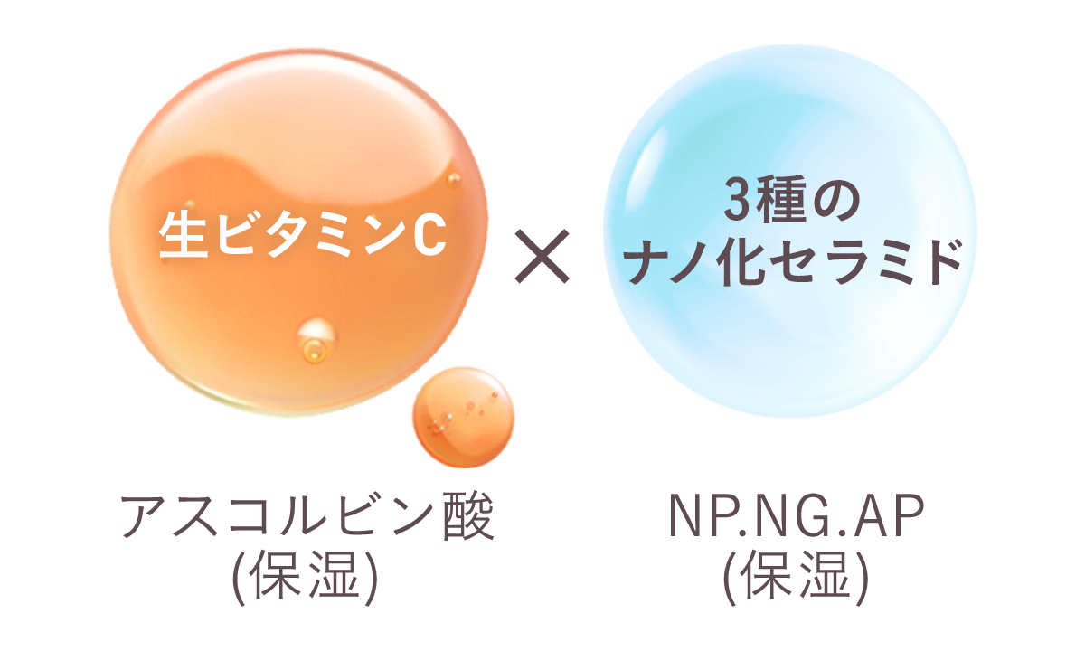 ①⽣ビタミンC※1 + 3種のナノ化セラミド※2配合でうるおい保湿ケア