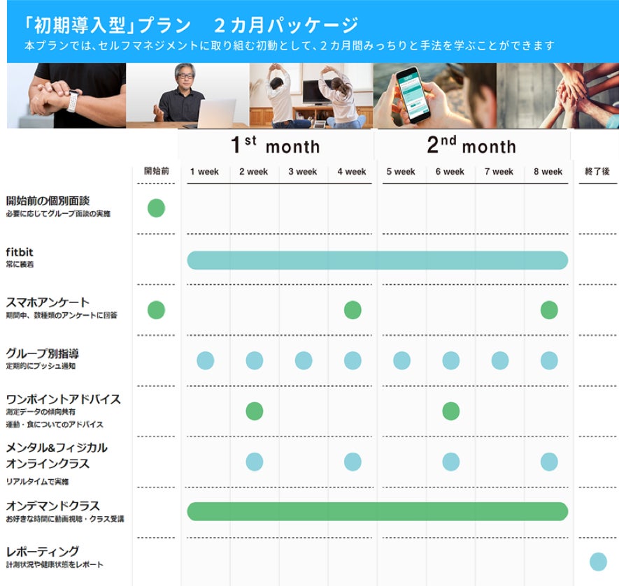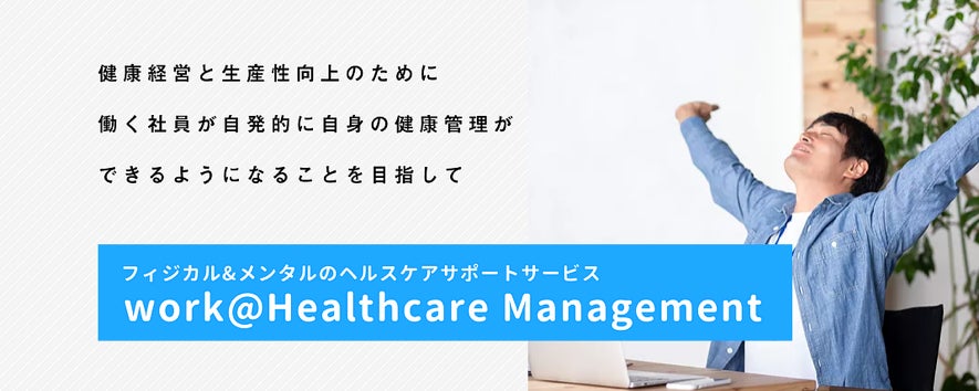 ワークアット株式会社では、健康経営と生産性向上のために、働く社員が自発的に自身の健康管理ができるようになることを目指して、HelthcareManagement事業を実施しています。2カ月間(8週間)通常どおりに仕事をしながら、Fitbitのウェアラブルデバイスやスマートフォンから回答する質問票により、心理的効果の傾向や身体的活動量の数値を計測し、分析結果をレポートでお渡しします。計測期間中は、オンラインで受講できるマインドフルネス瞑想や軽いトレーニングなどを通じて、心と身体のリバランスをはかることが可能です。また、定期的な健康情報を通知し、健康についての意識を高め、社員自身のセルフケアマネジメントに役立てます。