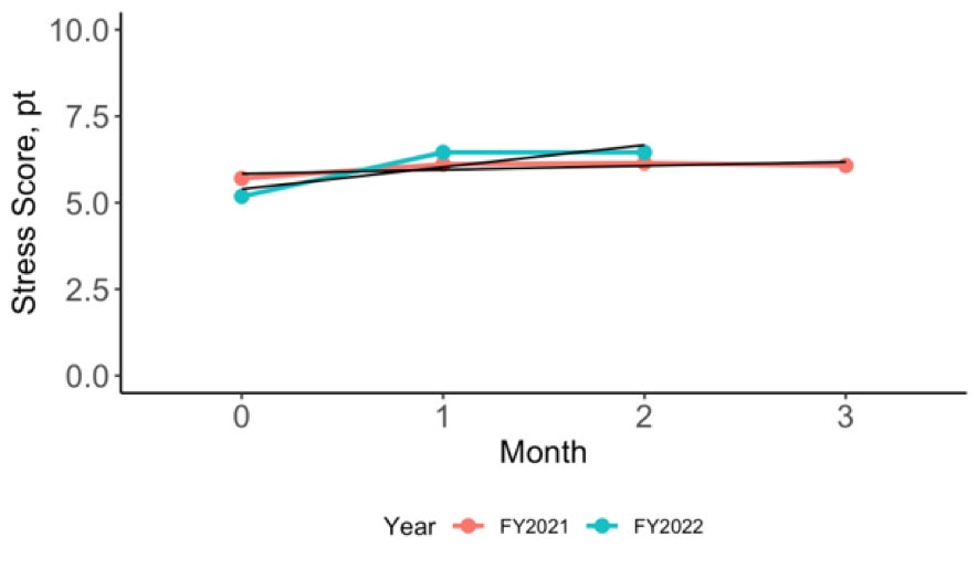 心理的ストレス指標のアンケートでは、どちらのグループもサービス終了後に改善している数値が見られました。また、属性の特徴として、グループ2(新入社員対象)の方が易怒感を除く、抑うつ感・身体不調感・疲労感の3項目についてグループ1よりも数値が高い傾向にありました。他の社員と比べて、新入社員に対してより手厚い心理的ストレスケアが必要かもしれません。
