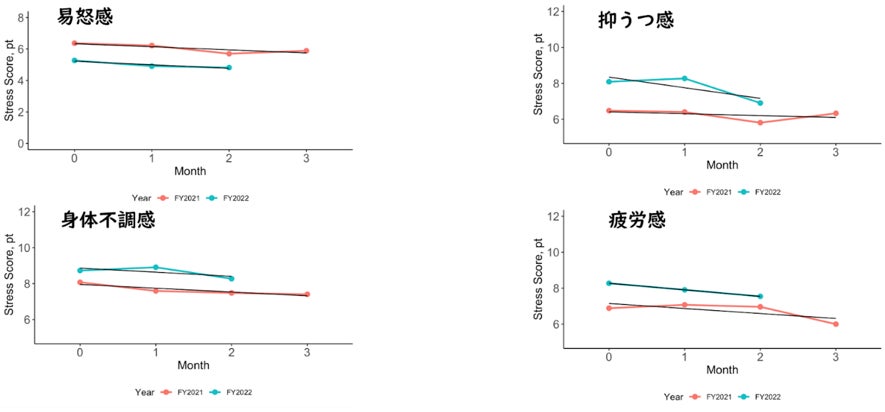 『新入社員グループ』は、易怒感を除く、抑うつ感・身体不調感・疲労感の3項目は数値が高い傾向にありました。他の社員と比べて、新入社員に対してより手厚い心理的ストレスケアが必要かもしれません。